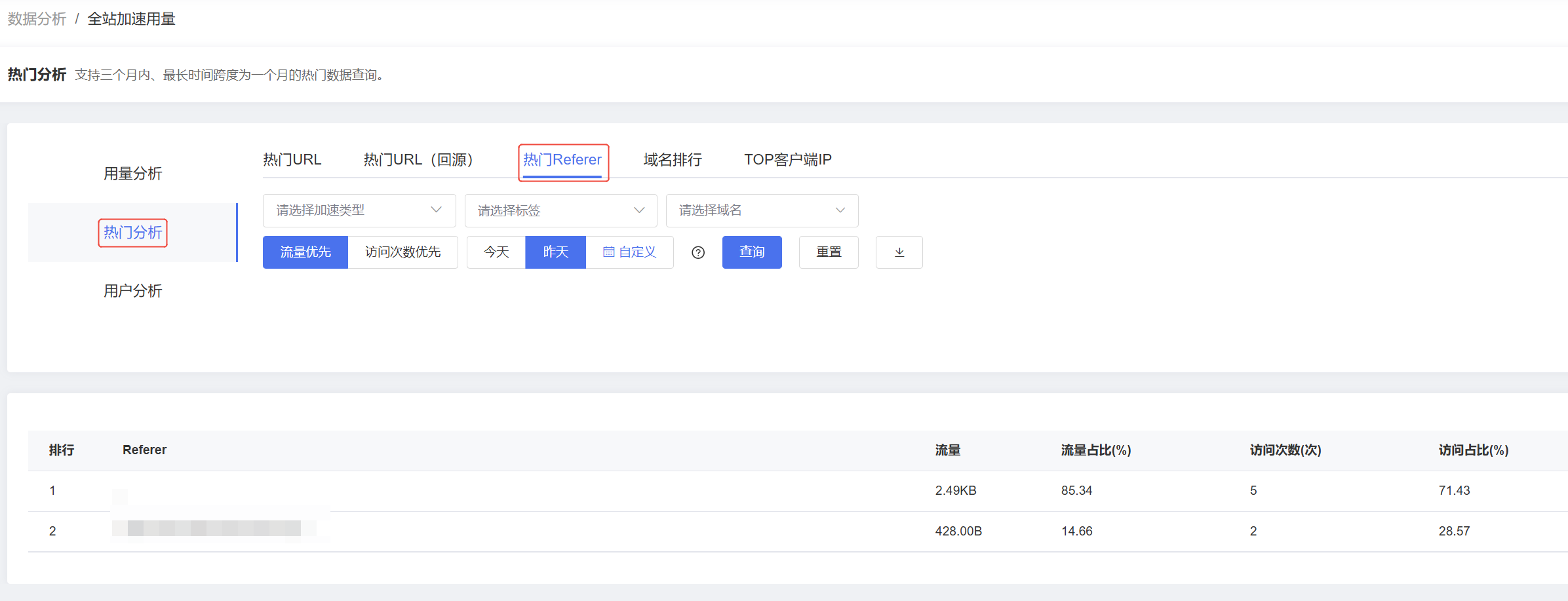 热门Referer支持客户按加速类型、标签、域名、流量优先、访问次数优先、时间等搜索条件,查询热门Referer、热门Referer对应的流量、流量占比、访问次数、访问占比。选择【流量优先】时按照流量大小排序,选择【访问次数优先】时按照访问次数排序,并支持表格导出。