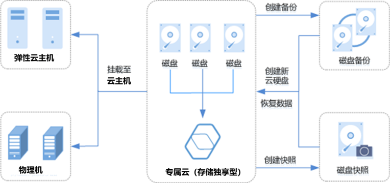 | 专属云(存储独享型) | 专属云(存储独享型)为用户提供独享的物理存储资源,存储池资源物理隔离,数据持久性高达99.9999999%,可同时对接多种不同类型的计算服务,如弹性云主机、物理机等,功能丰富、安全可靠。 | 存储池物理隔离,资源独享,专属存储。 |