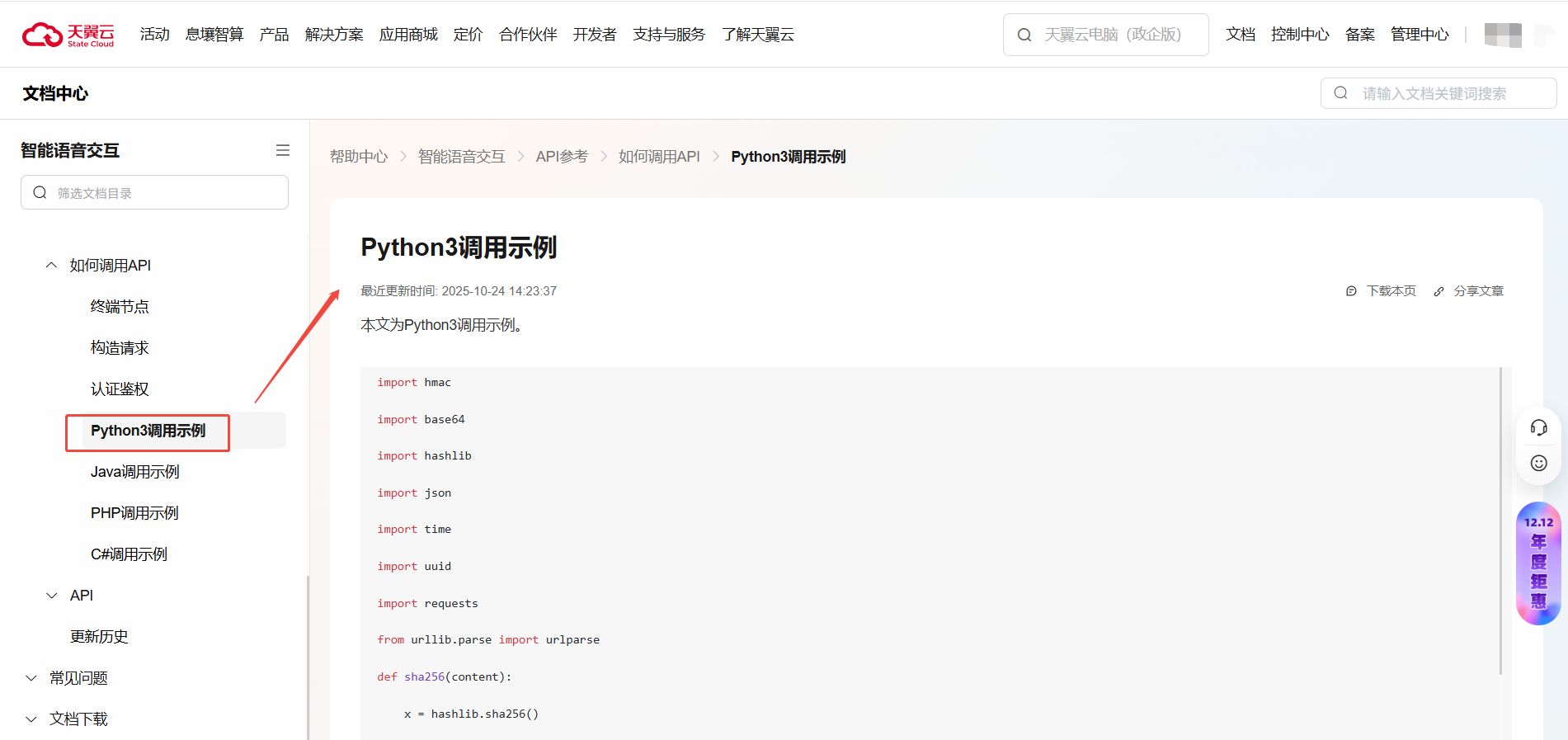 1.选择合适自己的开发工具,在这里用Python为例,点击Python3调用示例,选择复制全部代码;