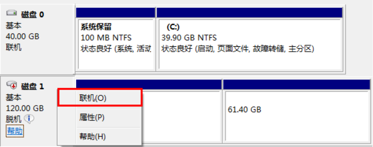 步骤 4 右键单击处于脱机状态的数据盘,选择“联机”,如下图所示。