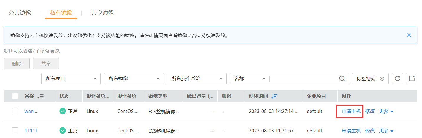 2、在“私有镜像”页签下,选中创建成功的整机镜像,单击操作列“申请主机”,进入创建云主机的向导页面。