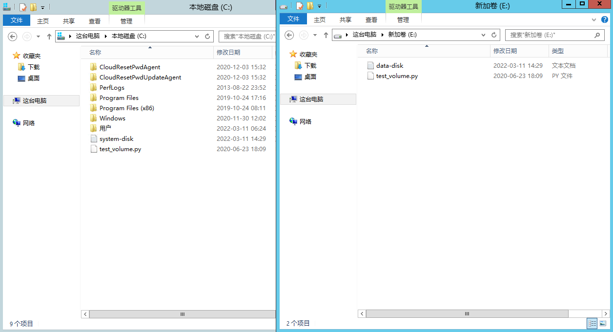 2、删除系统盘和数据盘中准备的数据,新增文件和数据如下图所示:
