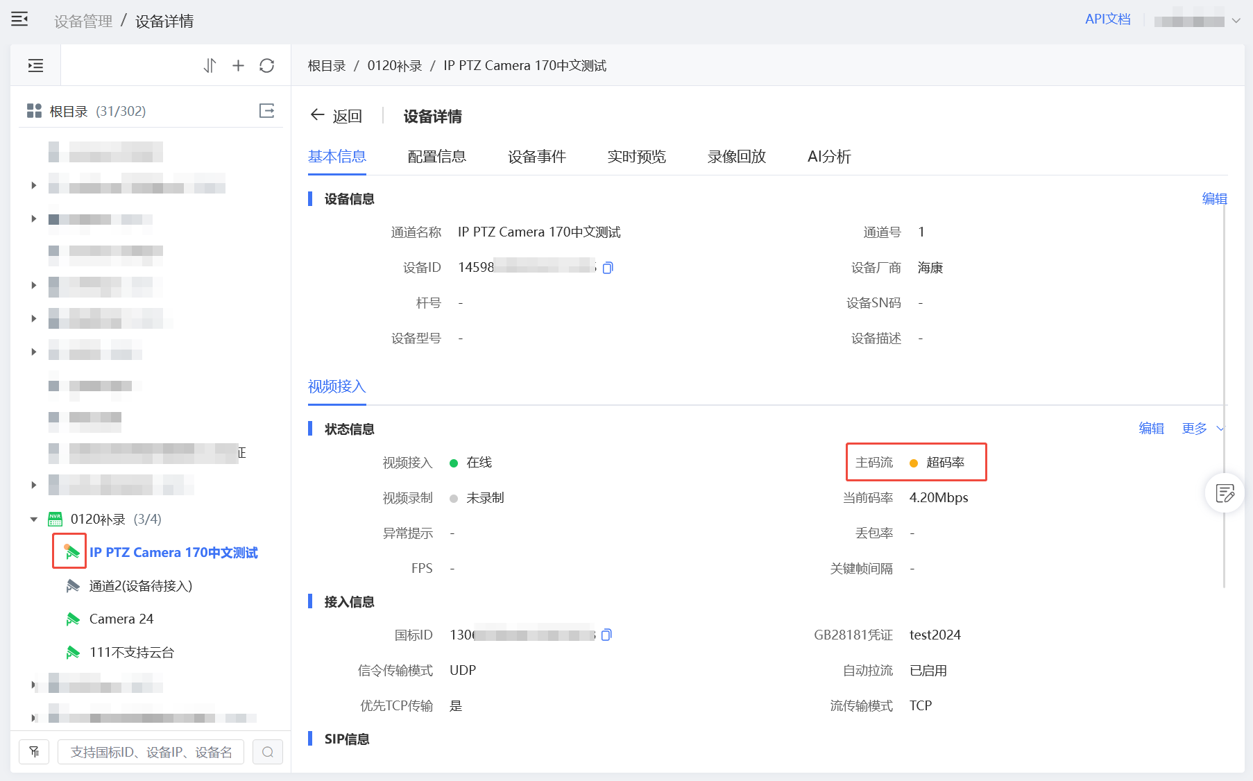 当设备成功接入到智能视图服务平台并保持流在线后,可以在设备详情页实时查看当前设备当前码率。当摄像头码率超过所配置的资源包码率时,设备流将无法正常上线,用户可通过流状态或设备事件查看到超码率异常提示。
