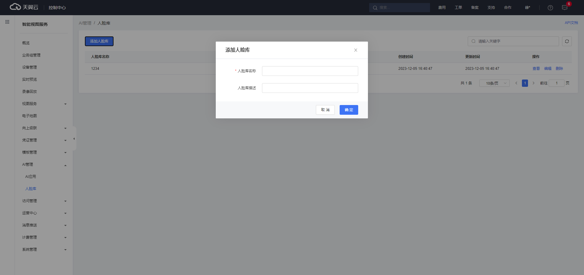 点击【添加人脸库】,进入该页面,输入名称和描述完成人脸库的创建。