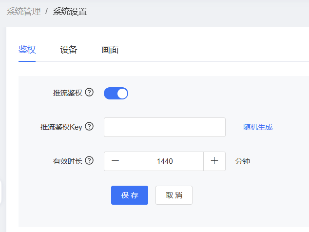 点击左侧导航栏的【系统管理-系统设置】,顶部选择【鉴权】进入该页面,支持用户使用推流鉴权和播放鉴权功能。