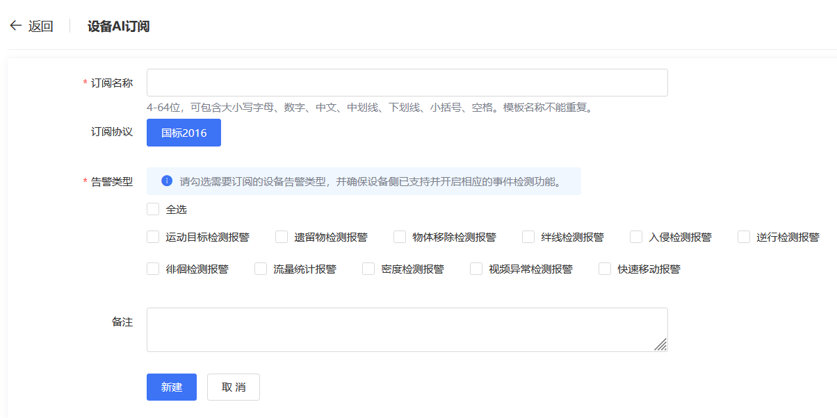 点击左侧导航栏的【AI管理-设备AI订阅】后点击【新建】进入该页面,用户需输入订阅名称、勾选需要订阅的设备告警类型,当前订阅协议仅支持国标2016版本(即仅支持为国标2016设备绑定订阅)。