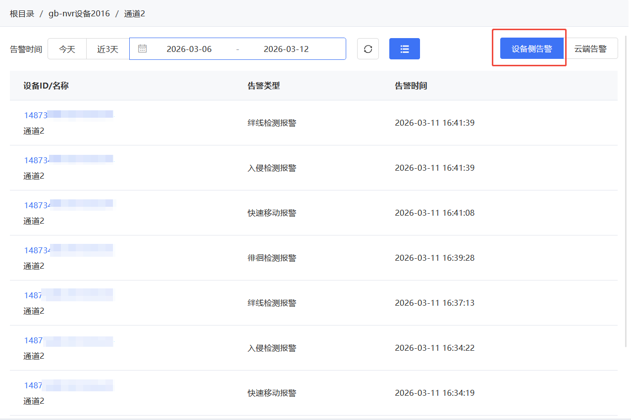 点击左侧导航栏的【运营中心-AI告警】,在设备树中选择设备点击查看【设备侧告警】,即可查看设备上报的告警类型及告警时间。