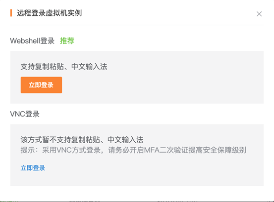 1、【登录】,远程登录虚拟机实例,包括Webshell登录和VNC登录两种方式,推荐使用Webshell登录。