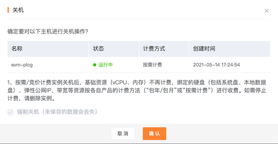 4、【关机】,对“运行中”的实例进行关机,弹框显示该虚拟机实例的信息,强制关机后未保存的数据会丢失。