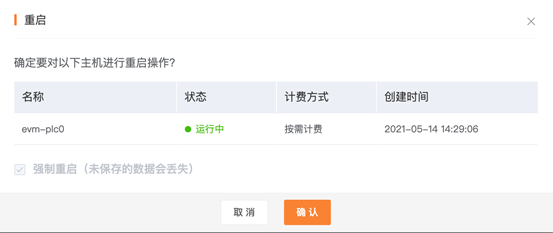 5、【重启】,对“运行中”的实例进行重启,弹框显示该虚拟机实例的信息,强制重启后未保存的数据会丢失。