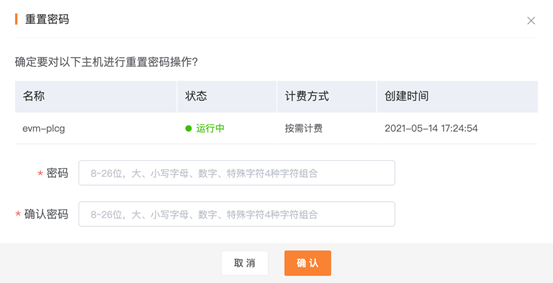 6、【重置密码】,对虚拟机实例的登录密码进行重置,弹框显示该虚实例的信息,输入密码和确认密码,密码需满足8~26位,大小写字母、数字、特殊字符4种字符组合。
