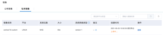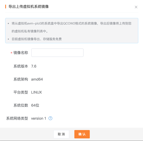 7、【导出镜像】,导出镜像前需先关机,将从虚拟机evm-plc0的系统盘中导出QCOW2格式的系统镜像,导出后镜像将上传到虚拟机私有镜像列表中。弹框会显示该虚拟机的镜像信息(系统版本、架构、平台类型、系统位数、网络类型),需输入镜像名称,镜像名称由英文字母、数字、中划线、下划线、或者 "."组成,以英文字母开头。点击【确认】后,可选择前往“私有镜像列表”查看导出的镜像或返回实例列表。