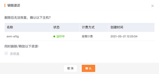 8、【销毁退还】,删除虚拟机,删除后无法恢复,同时删除实例的系统盘。