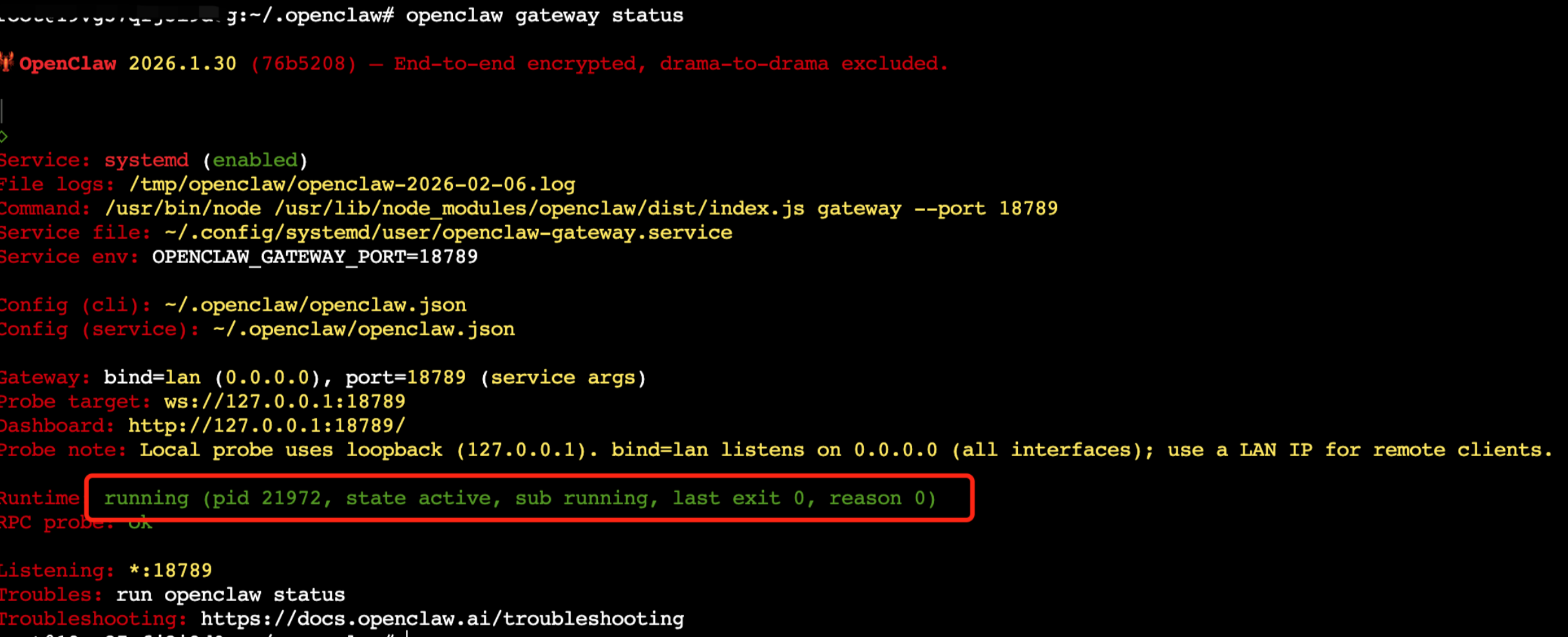 openclaw gateway restart3、检查gateway状态,确认为running,表示配置已更新成功。