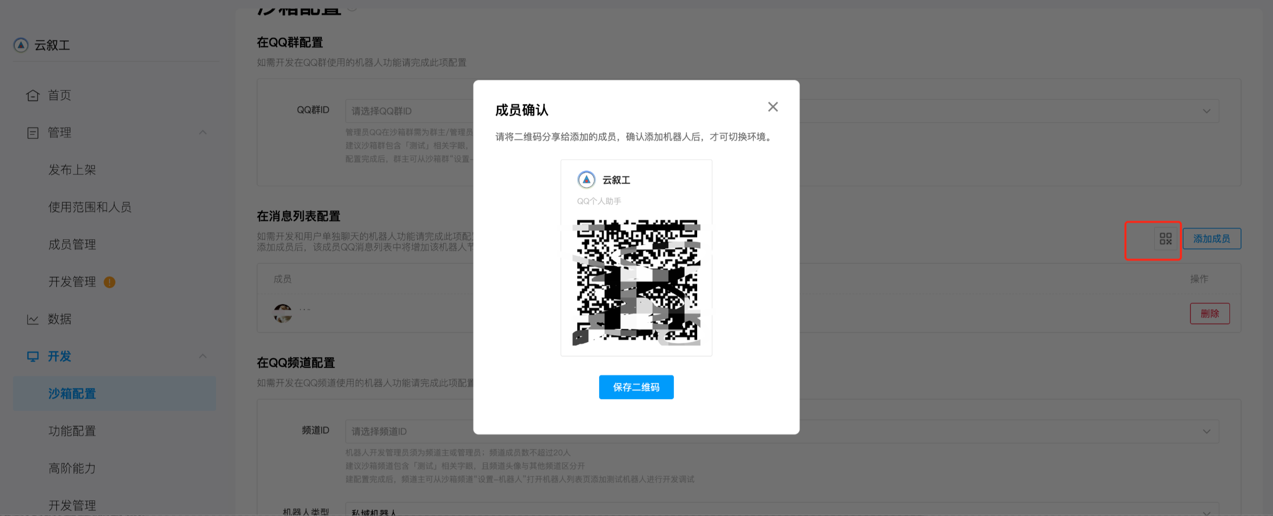 添加成员后,通过该成员的QQ扫码来添加机器人。