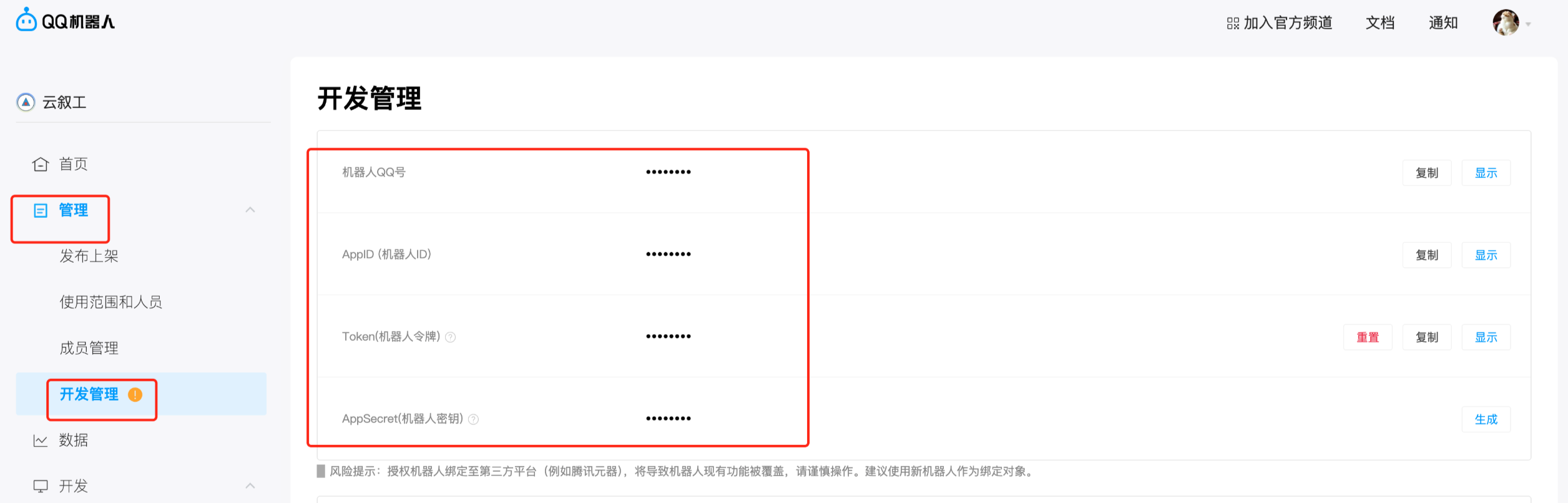 点击管理-开发管理,获取AppID、AppSecret等信息,记录下来。