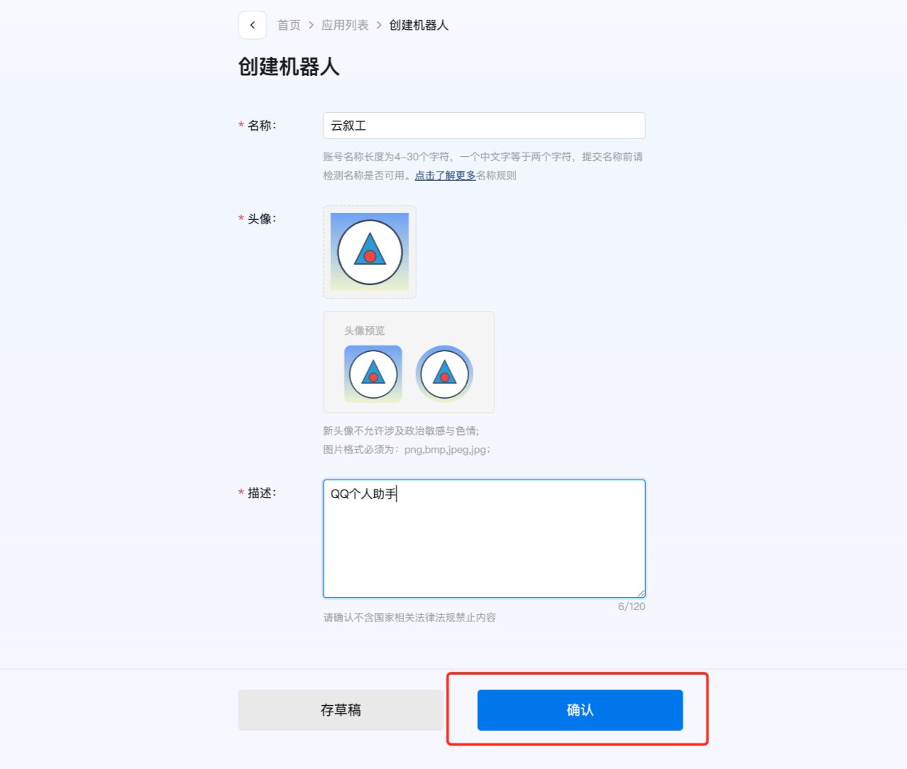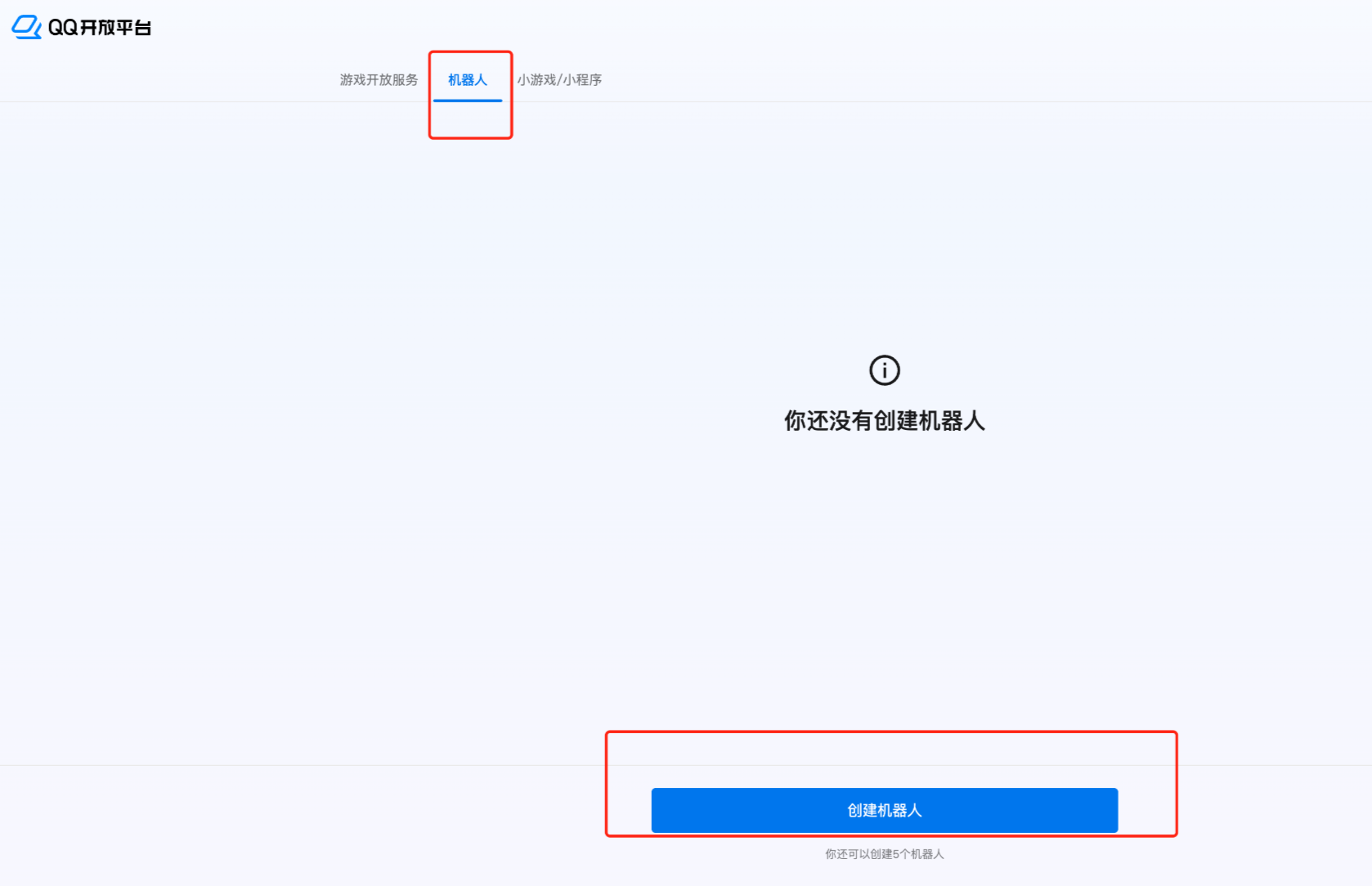 成功登录QQ开放平台后,选择机器人标签页,创建机器人。