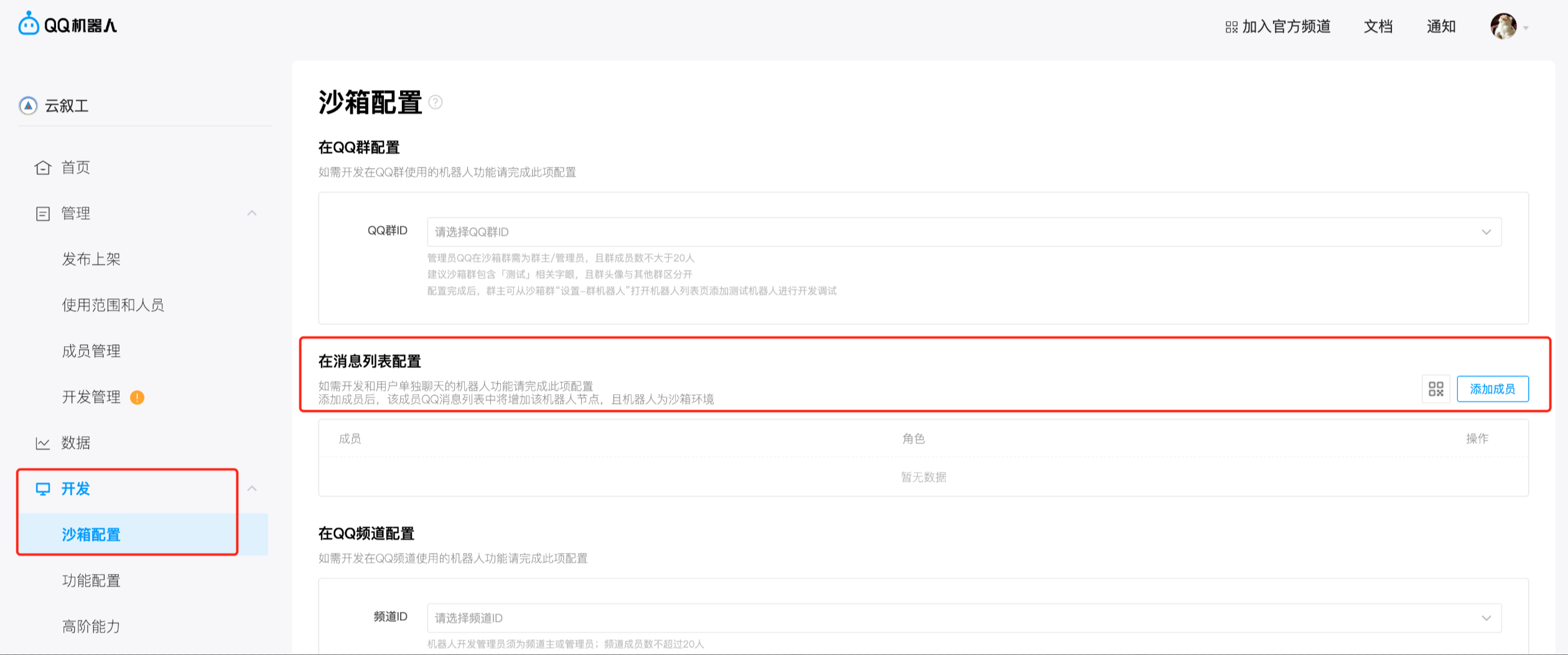 进入开发-沙箱配置,在消息列表配置,点击添加成员,添加自己的账号,选择单独聊天。