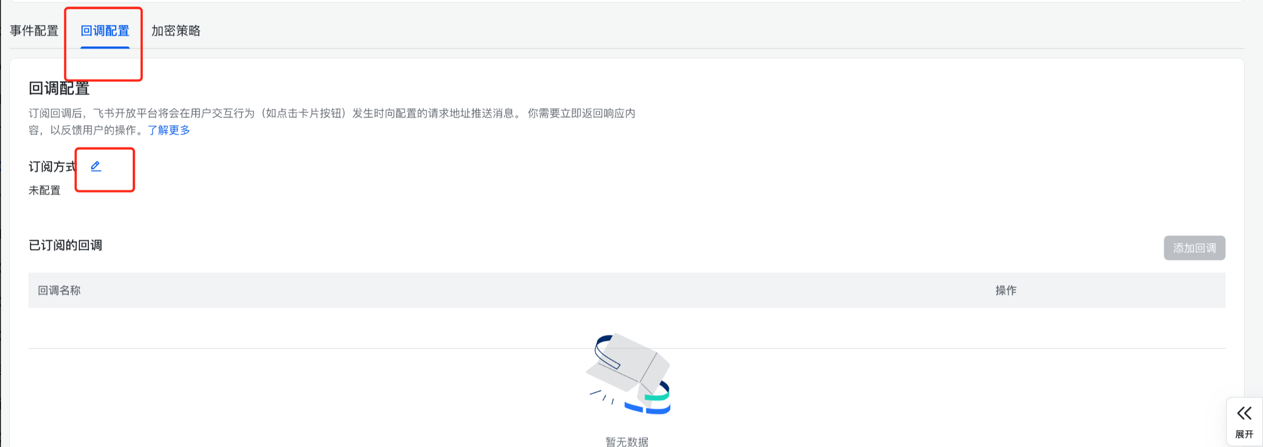 选择“回调配置”页签,单击“订阅方式”旁的编辑按钮。