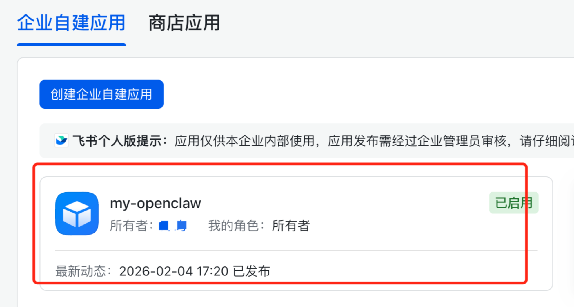 5、选择“企业自建应用”页签,并单击您创建的飞书开放应用。