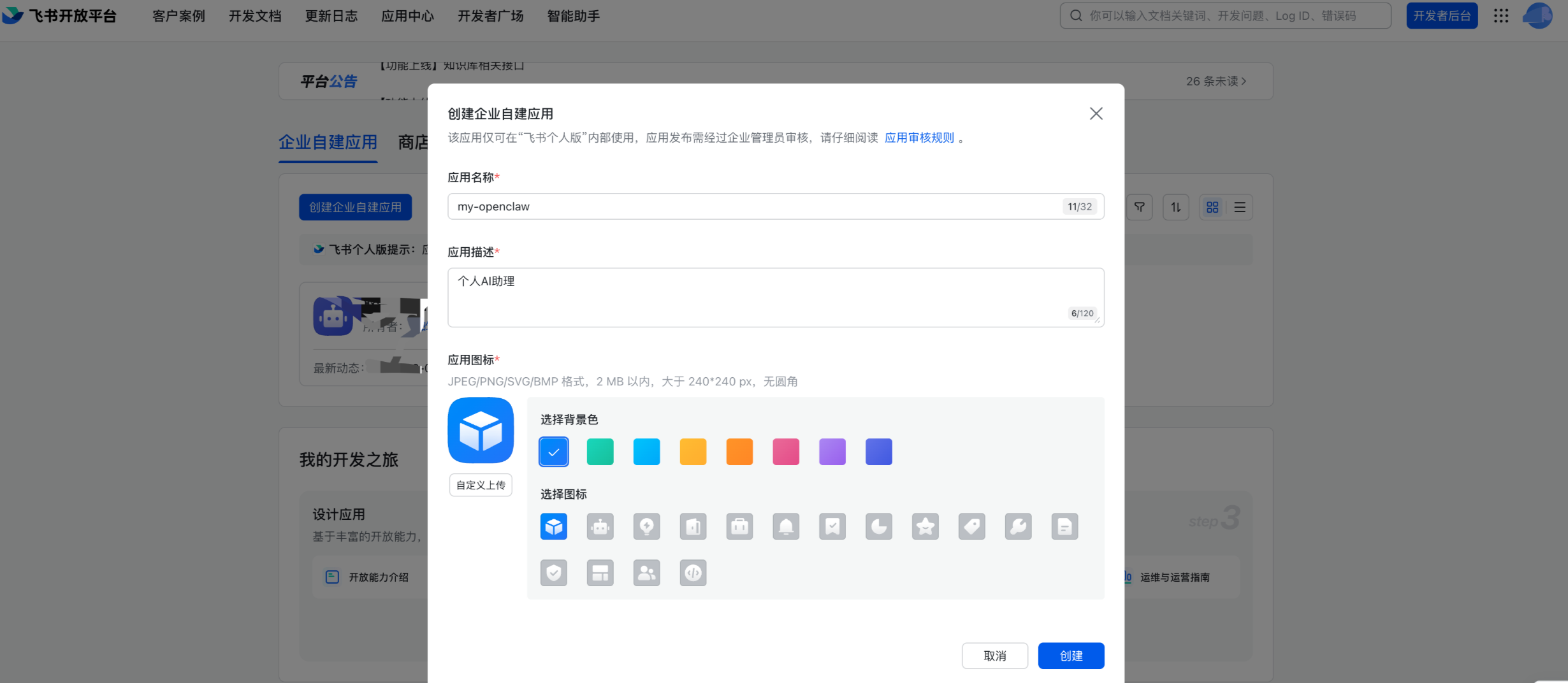 1、登录飞书开放平台,创建企业自建应用。