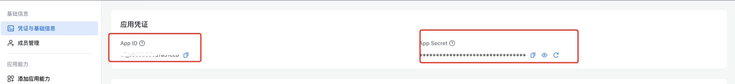 在“应用凭证”模块中,获取并记录App ID与App Secret信息。