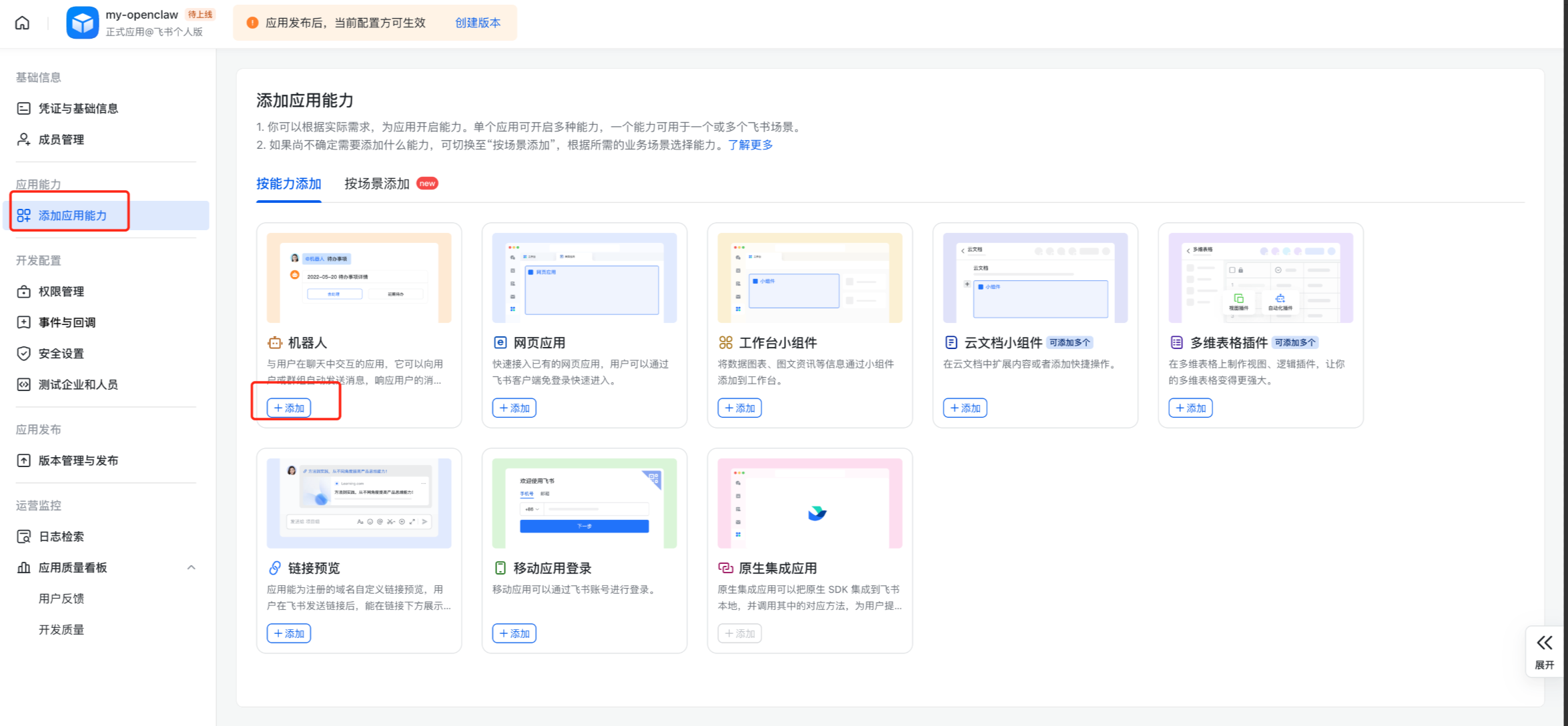 选择“按能力添加”页签,单击“机器人”能力卡片的“添加”按钮。