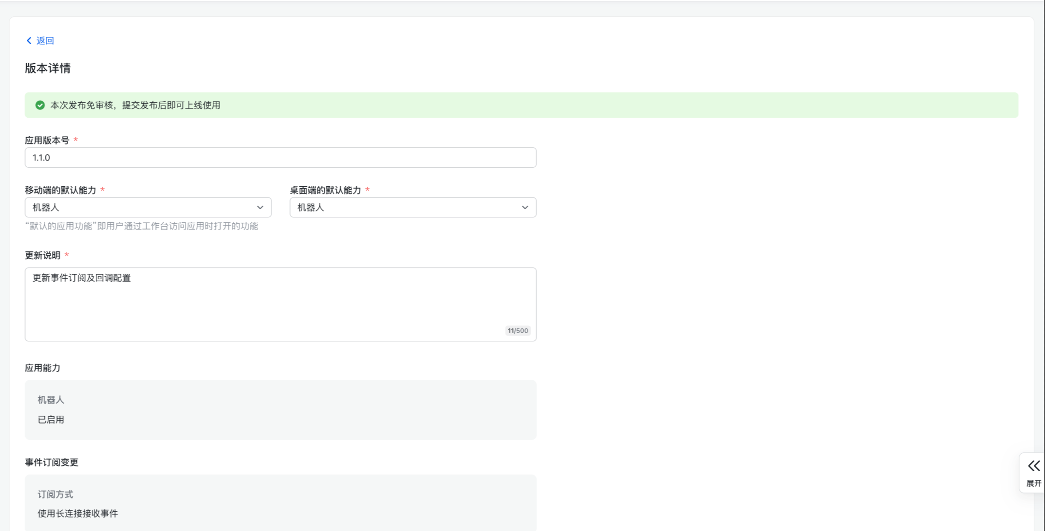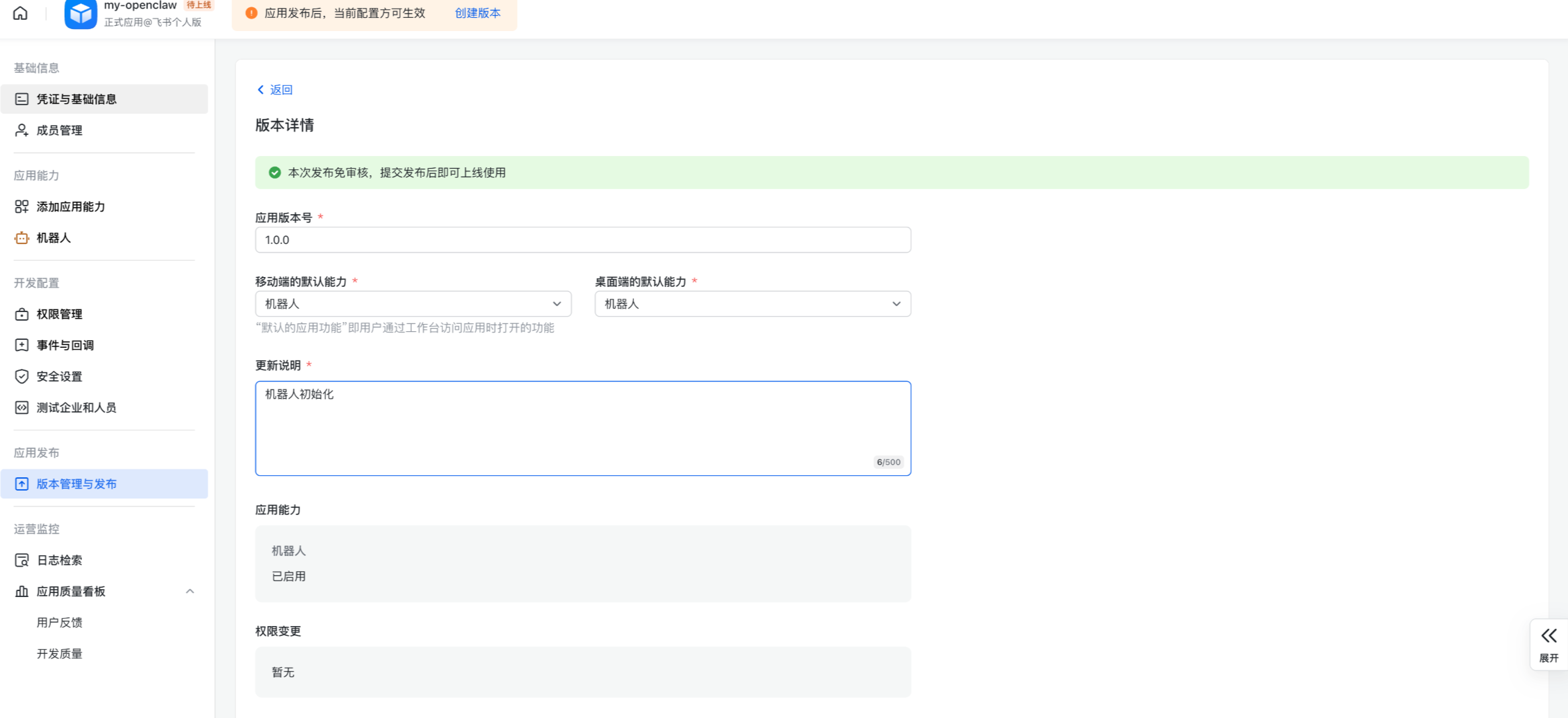 按需配置应用版本号、默认能力及更新说明等信息。