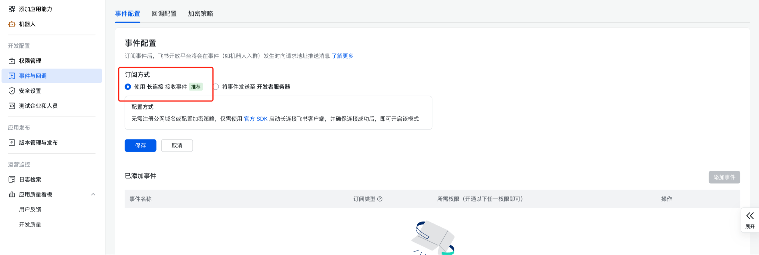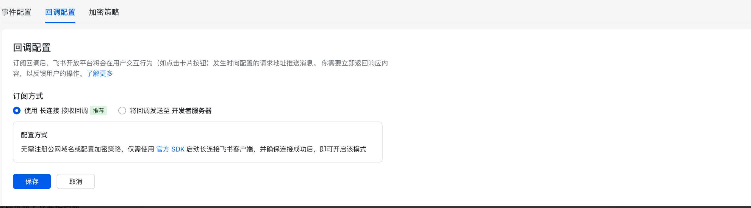 选择“使用 长连接 接收回调”,并单击“保存”按钮。