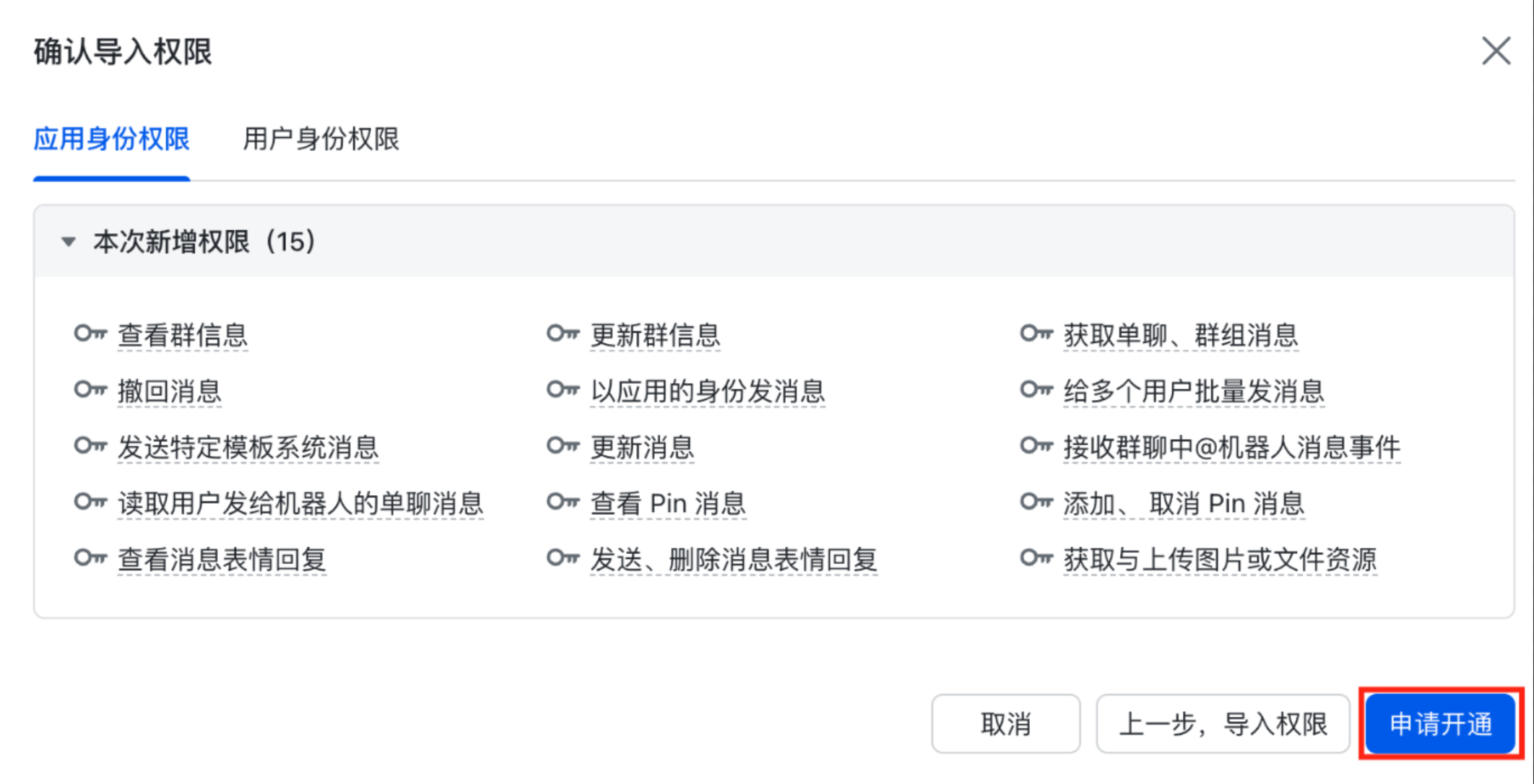 }在弹窗中确认权限无误后,单击“申请开通”按钮,完成操作。