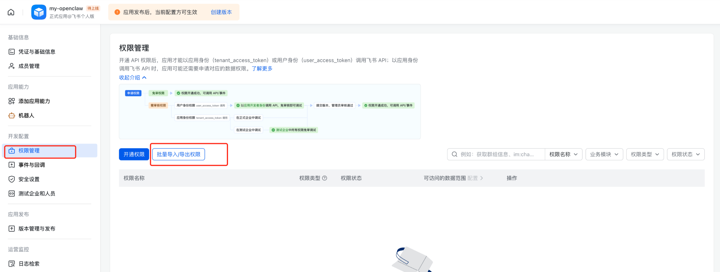 在左侧目录树选择“开发配置 > 权限管理”,单击“批量导入/导出权限”按钮。