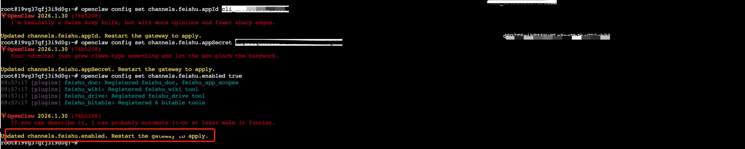 openclaw config set channels.feishu.enabled true3、执行如下命令,重启openclaw。