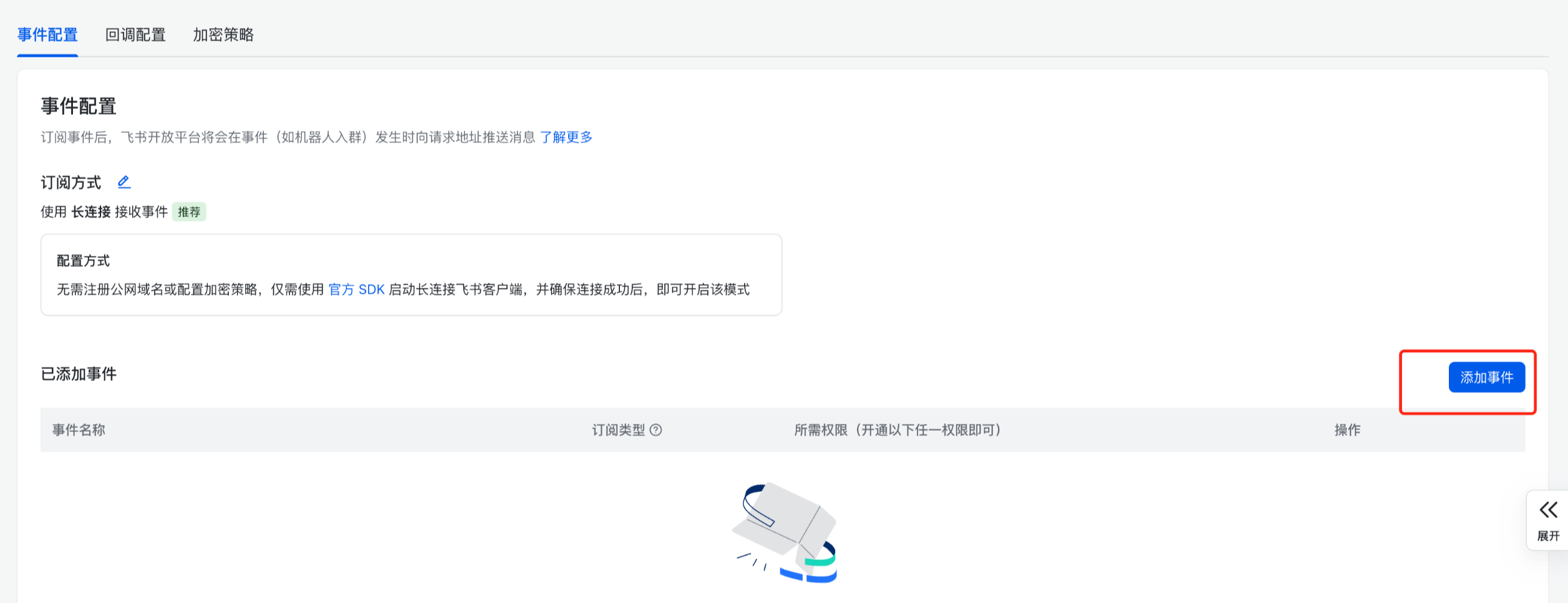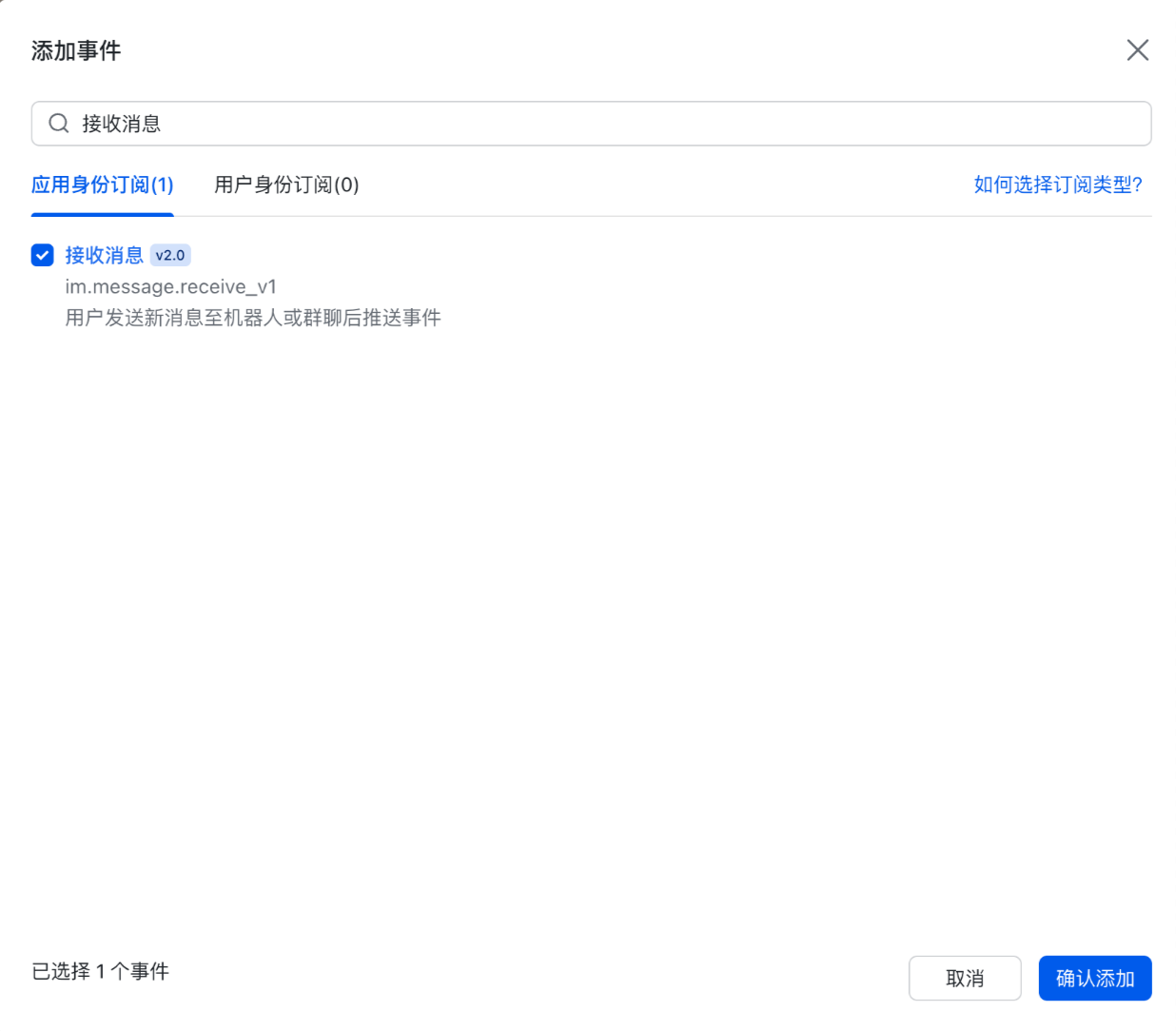 在添加事件对话框中,选择“应用身份订阅”页签,并勾选“接收消息”及其它您需要订阅的事件,单击“确认添加”按钮。