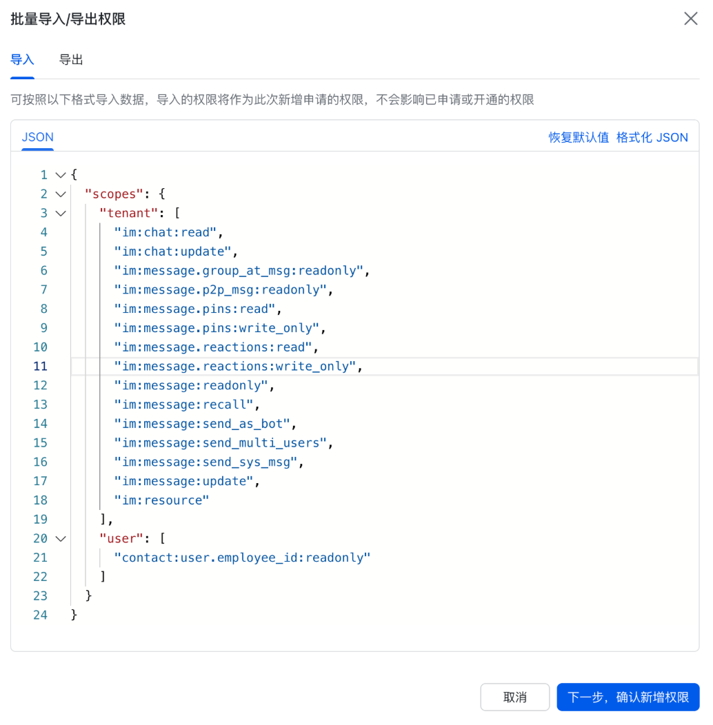 在“导入”页签中,将如下权限替换原有示例,单击“下一步,确认新增权限”按钮。