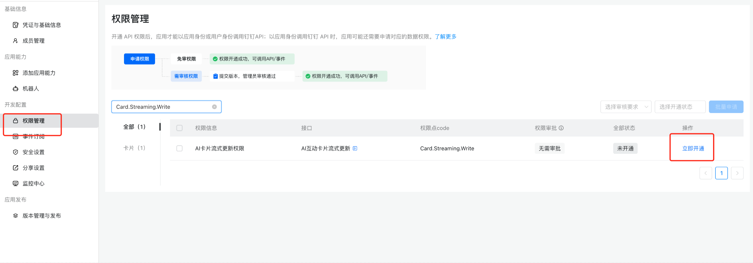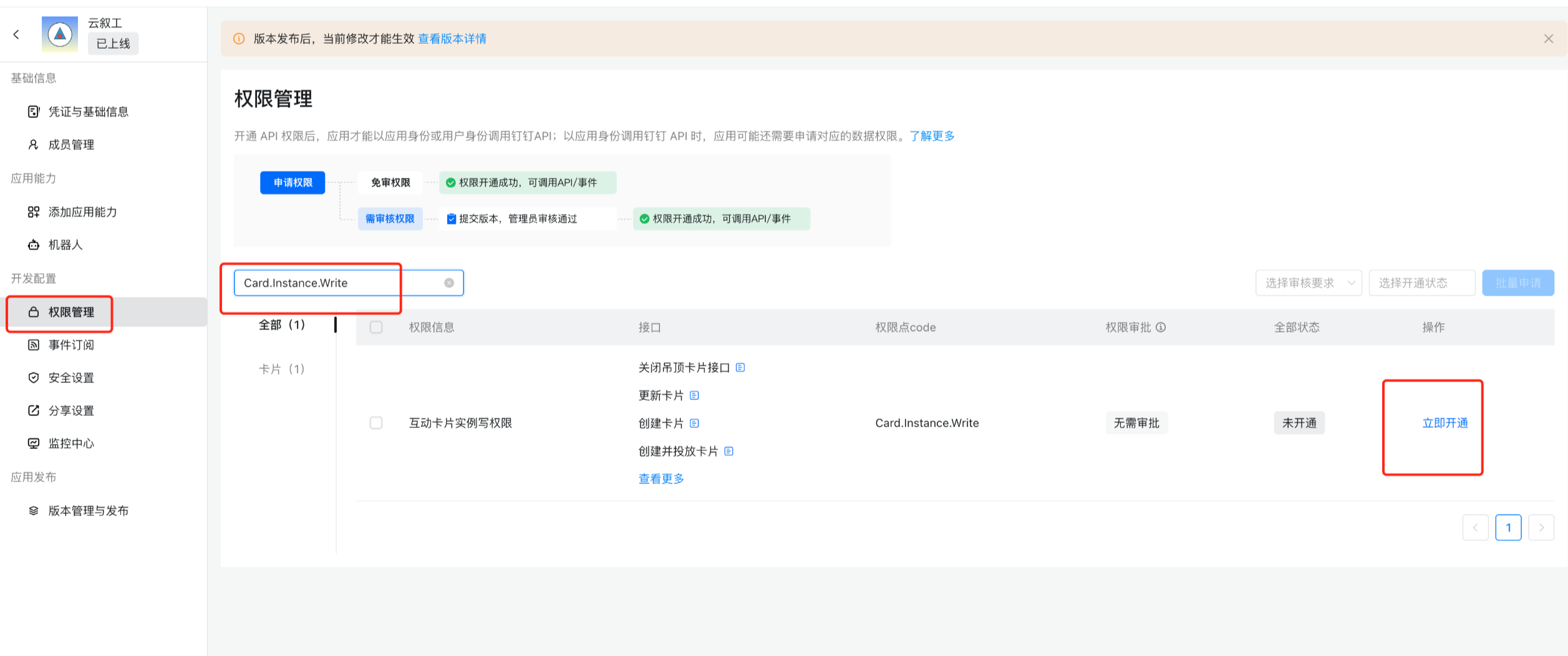 4、点击开发配置-权限管理,添加权限Card.Streaming.Write、Card.Instance.Write。
