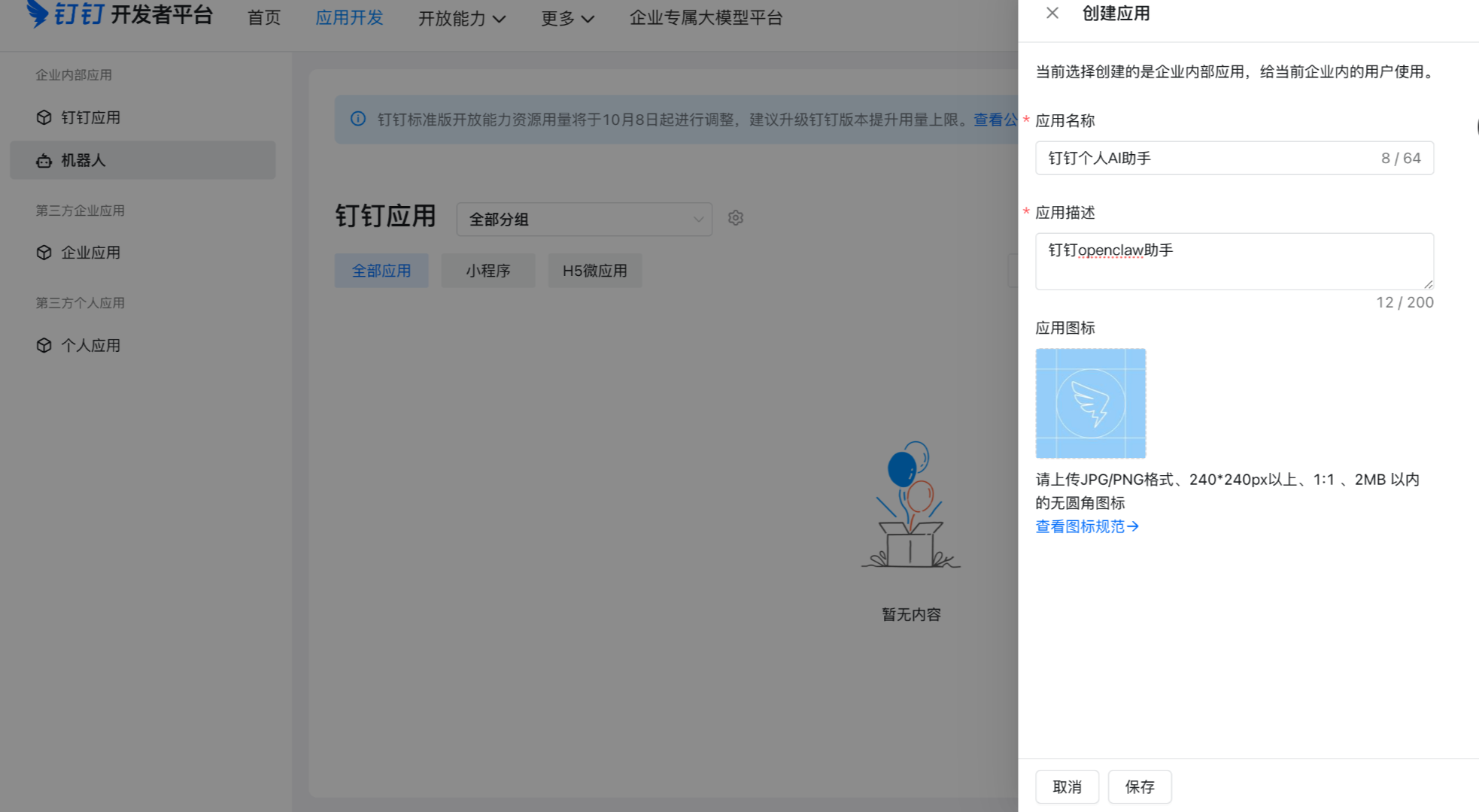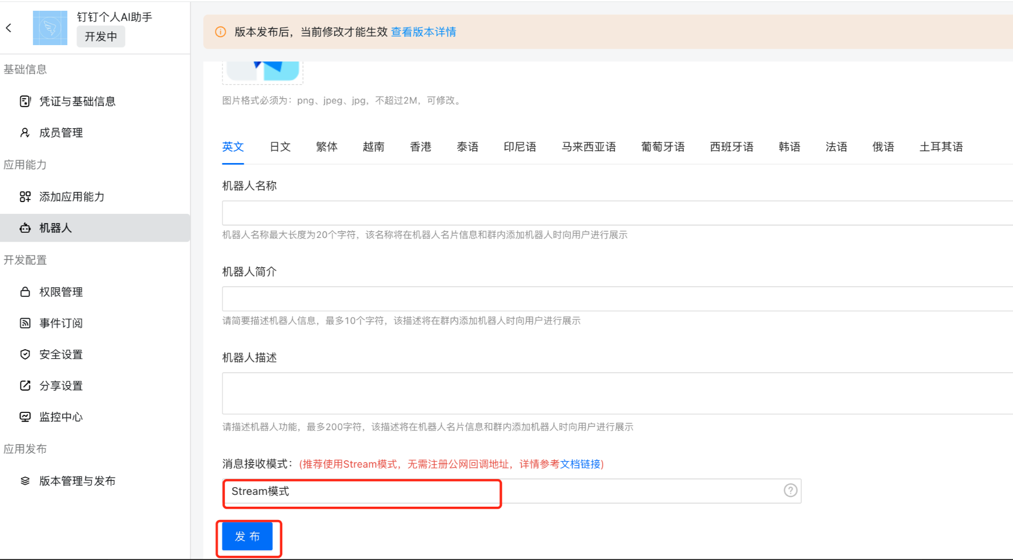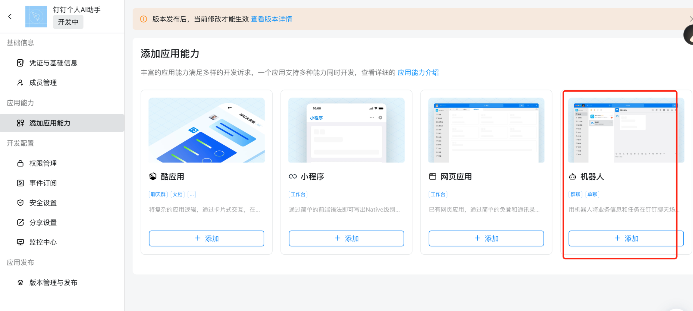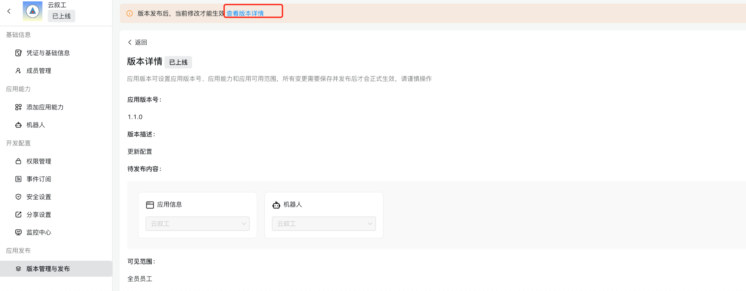 openclaw gateway restart3、进入版本管理与发布,发布刚刚创建的应用及机器人配置。
