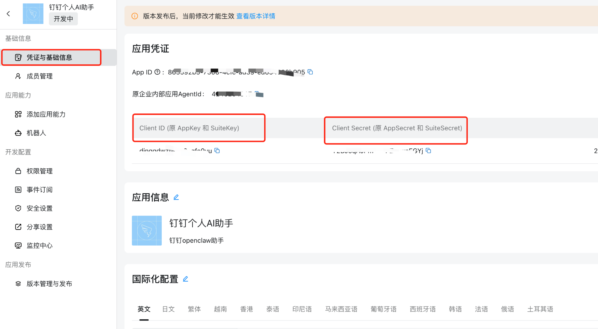 点击凭证与基础信息,获取并保存钉钉的Clinet ID 和 Client Secret 用于配置云主机信息。