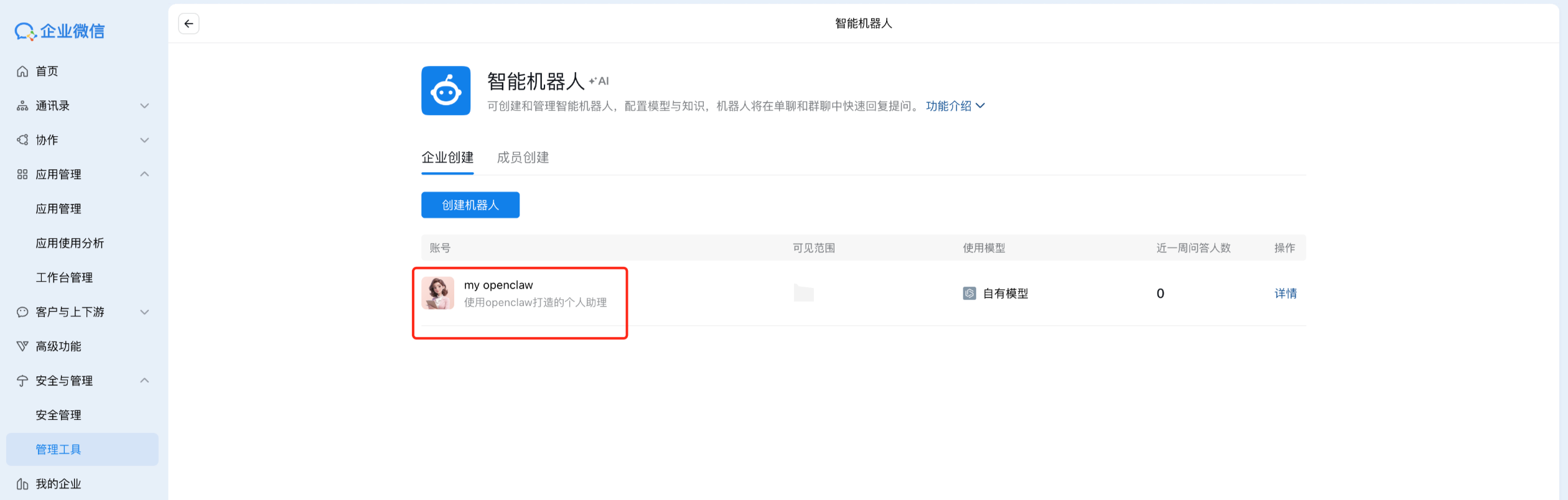 在企业微信管理后台进入安全管理-管理工具,点击智能机器人。