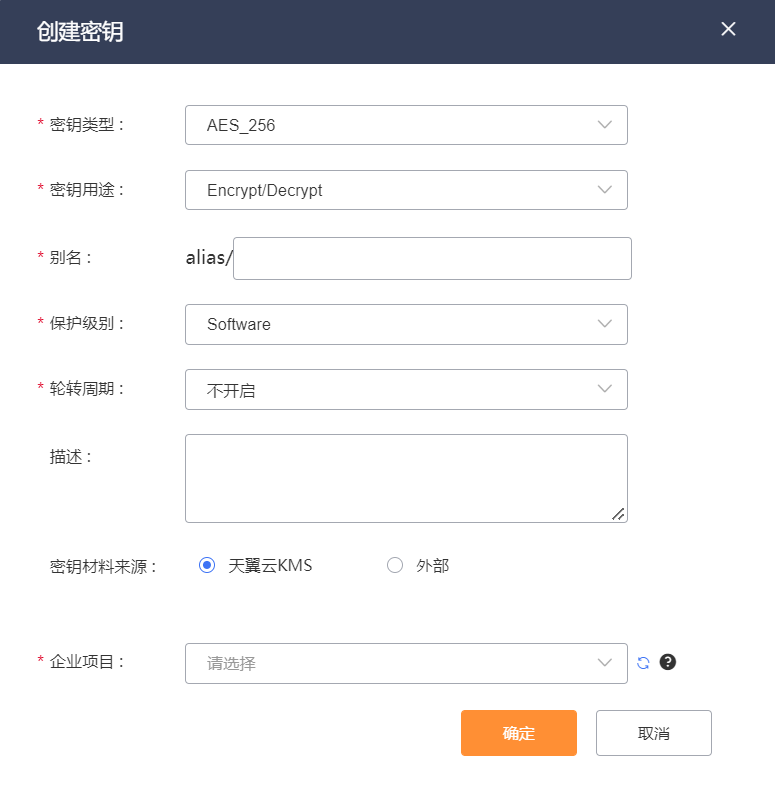 通过密钥管理服务控制台创建用户主密钥CMK。