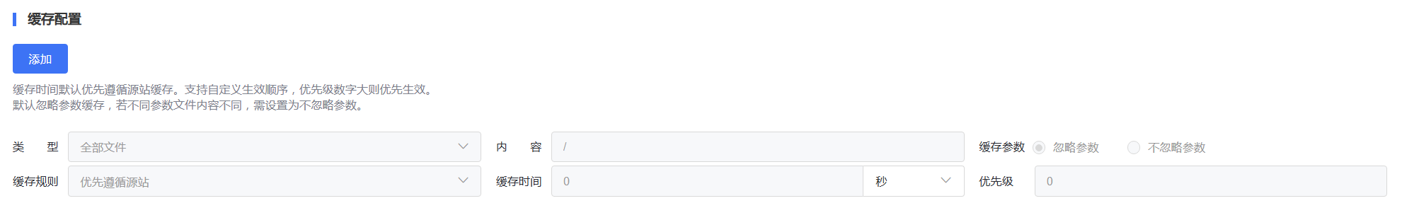 | 缓存配置 | 缓存配置 | 合理配置缓存规则,可以提高您的文件加速效果。 | 缓存过期时间设置 |