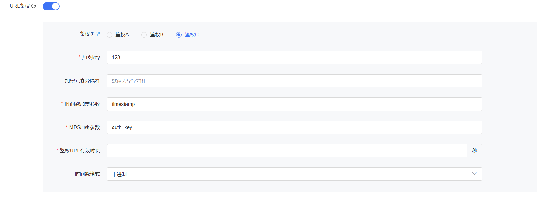 | 时间戳格式 | 鉴权时间戳格式,默认为十进制,也可选择十六进制/YYYYMMDDHHMMSS | 十进制 |