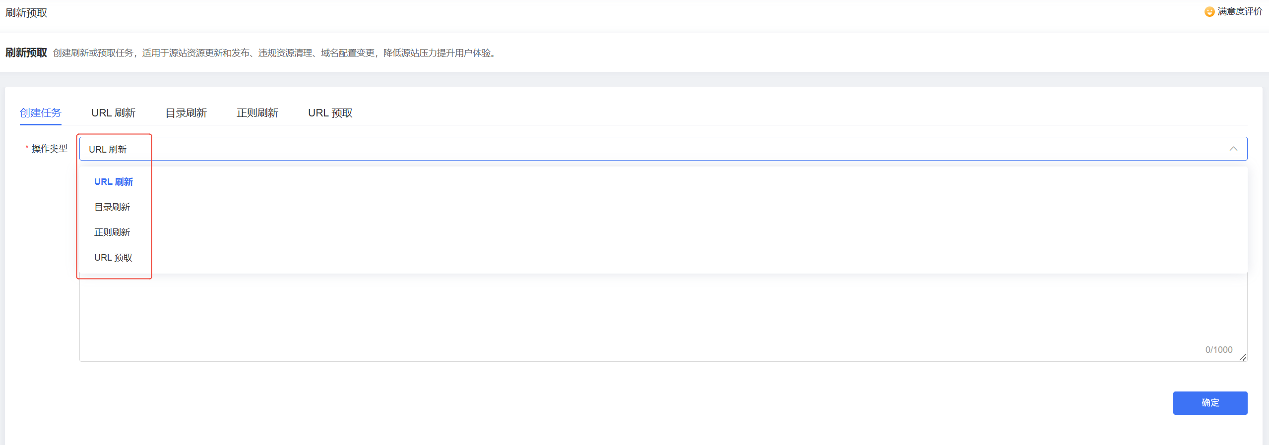 操作类型按实际场景需求,按需选择【URL刷新】、【目录刷新】、【正则刷新】、【URL预取】。