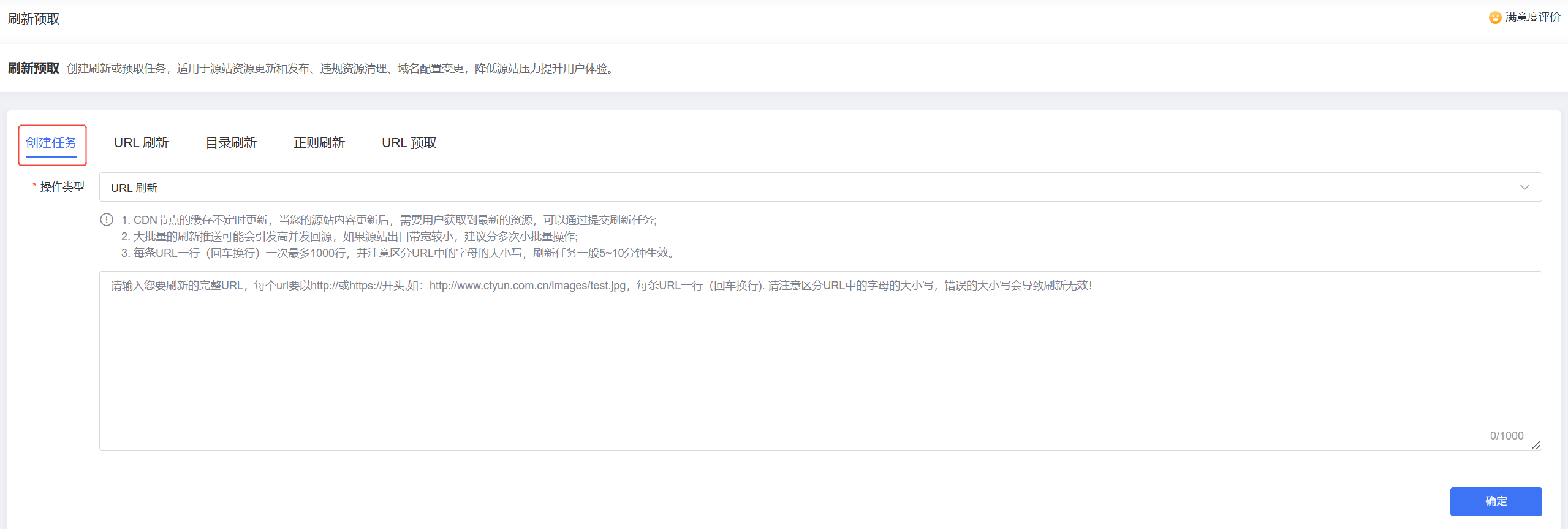 | URL预取 | 输入需要预取的完整URL,每个URL要以http://或https://开头,如: http://www.ctyun.cn/images/test.jpg,每条URL一行(回车换行),请注意区分URL中的字母的大小写,错误的大小写会导致预取无效。 |