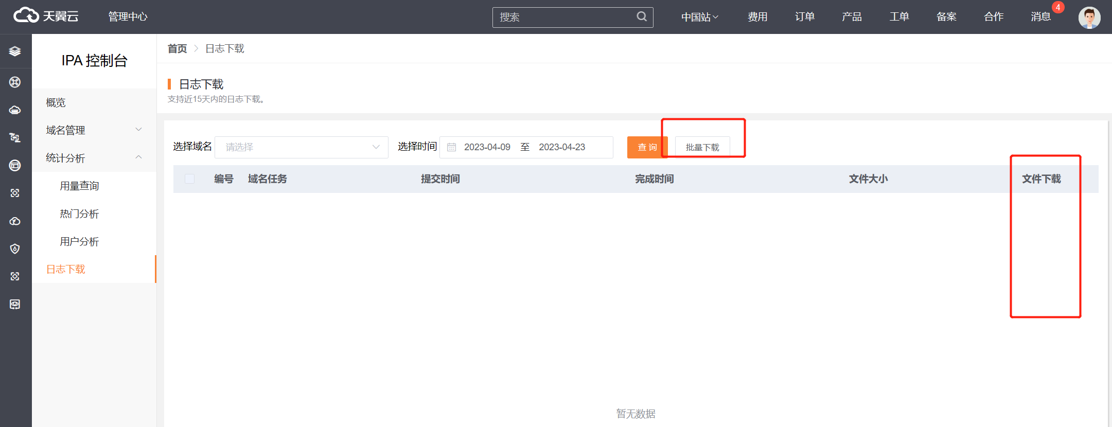 客户控制台可选择域名和时间范围查询日志,最多支持近15天的日志下载,同时支持单个日志下载和批量下载。