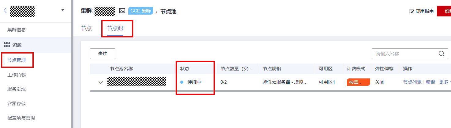 请登录CCE控制台,前往“集群信息->资源->节点管理->节点池”,查看问题节点池状态。若该节点池状态处于伸缩中,请等待节点池伸缩完毕,并参考问题场景二关闭节点池弹性伸缩能力。
