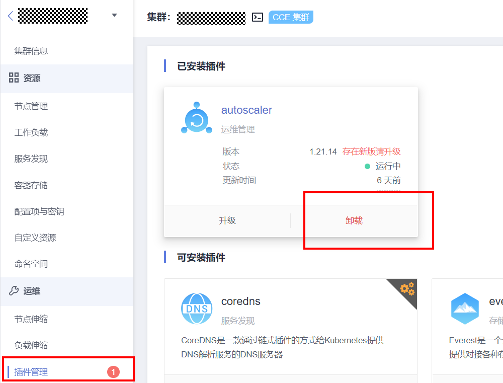 卸载autoscaler插件前,请单击“升级”按钮,备份当前插件配置,便于重装时还原插件配置。