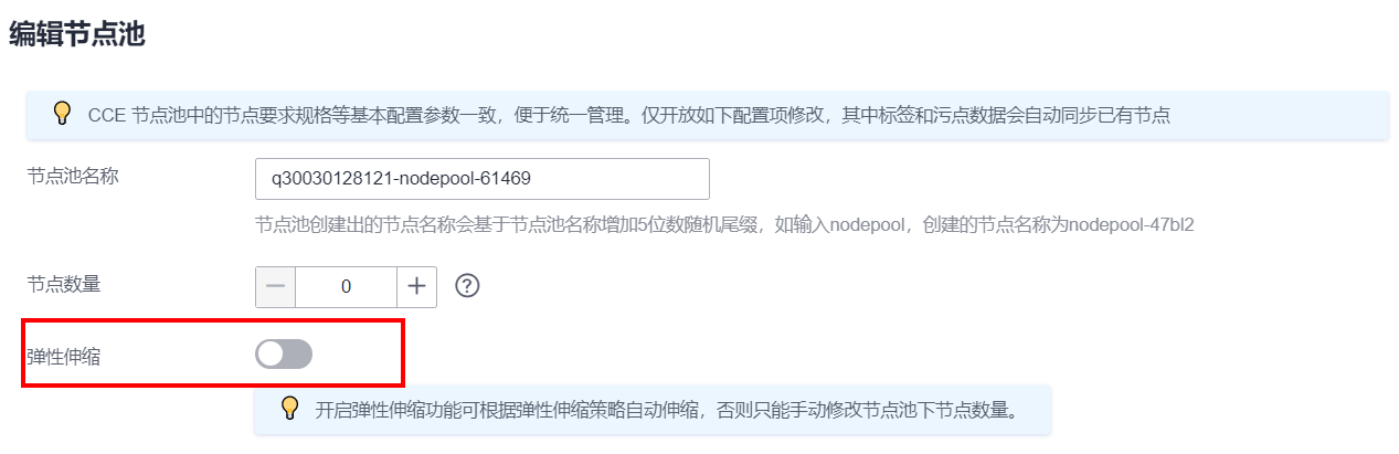 关闭弹性伸缩时,请备份当前节点池弹性伸缩配置,便于开启时还原配置。