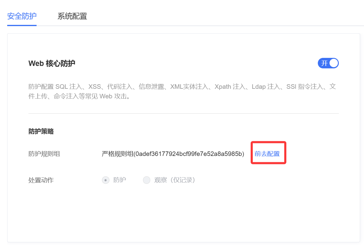 在“安全防护”页签定位到“Web核心防护”模块,在防护规则组后方点击“前去配置”。