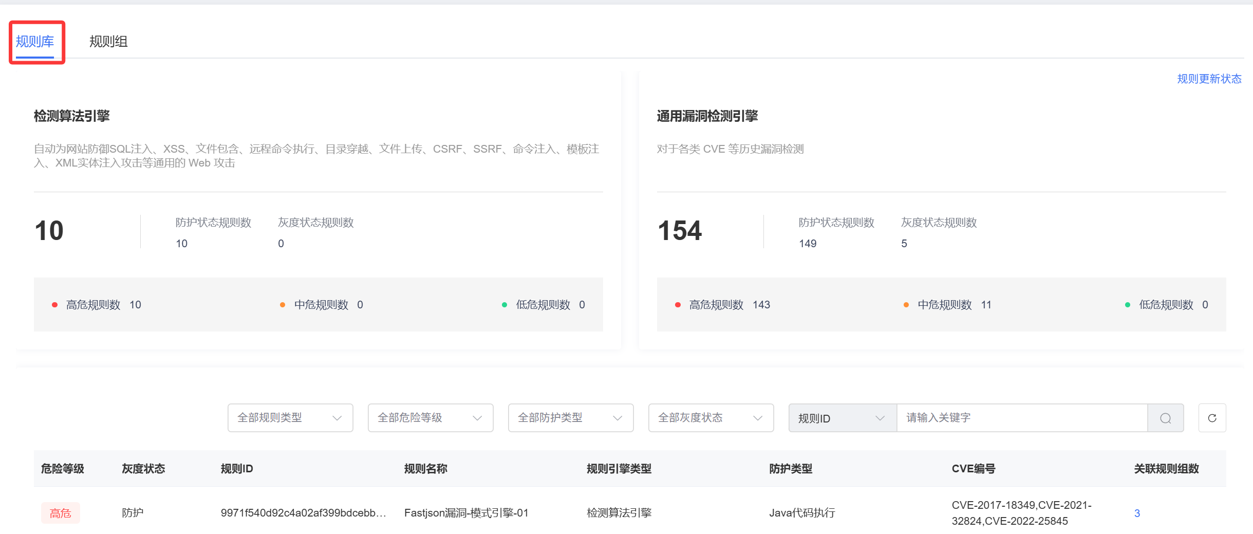 灰度状态 规则的状态说明。 规则ID WAF防护引擎中可唯一标识该规则的ID。 规则引擎类型 描述WAF防护规则的引擎类型 规则名称 防护规则的描述信息。 防护类型 表示规则防御的Web攻击类型。