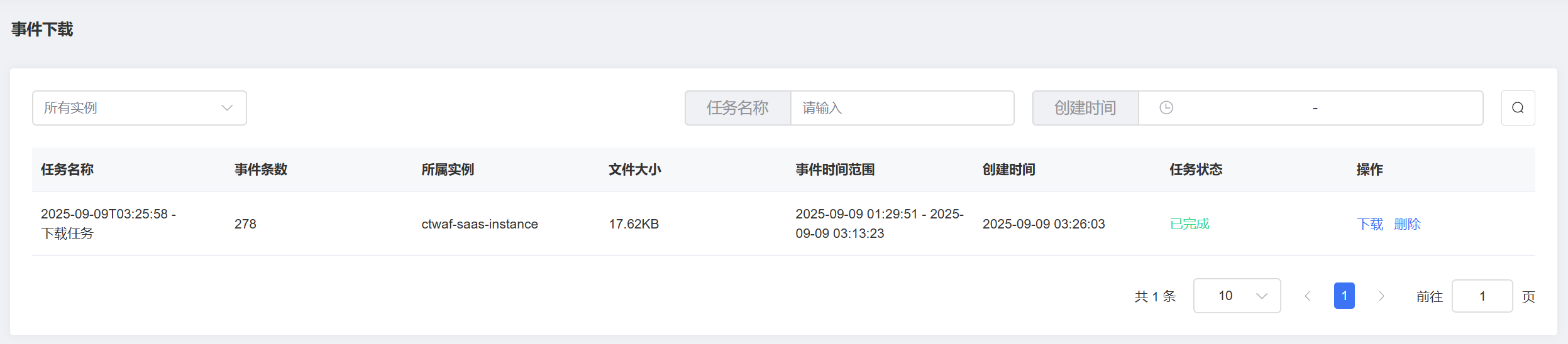 云WAF将所有在防护事件模块下载的事件任务统一保存在事件下载中,用户可在事件下载列表中查看任务名称、事件条数、所属实例、文件大小、事件时间范围、创建时间、任务状态。